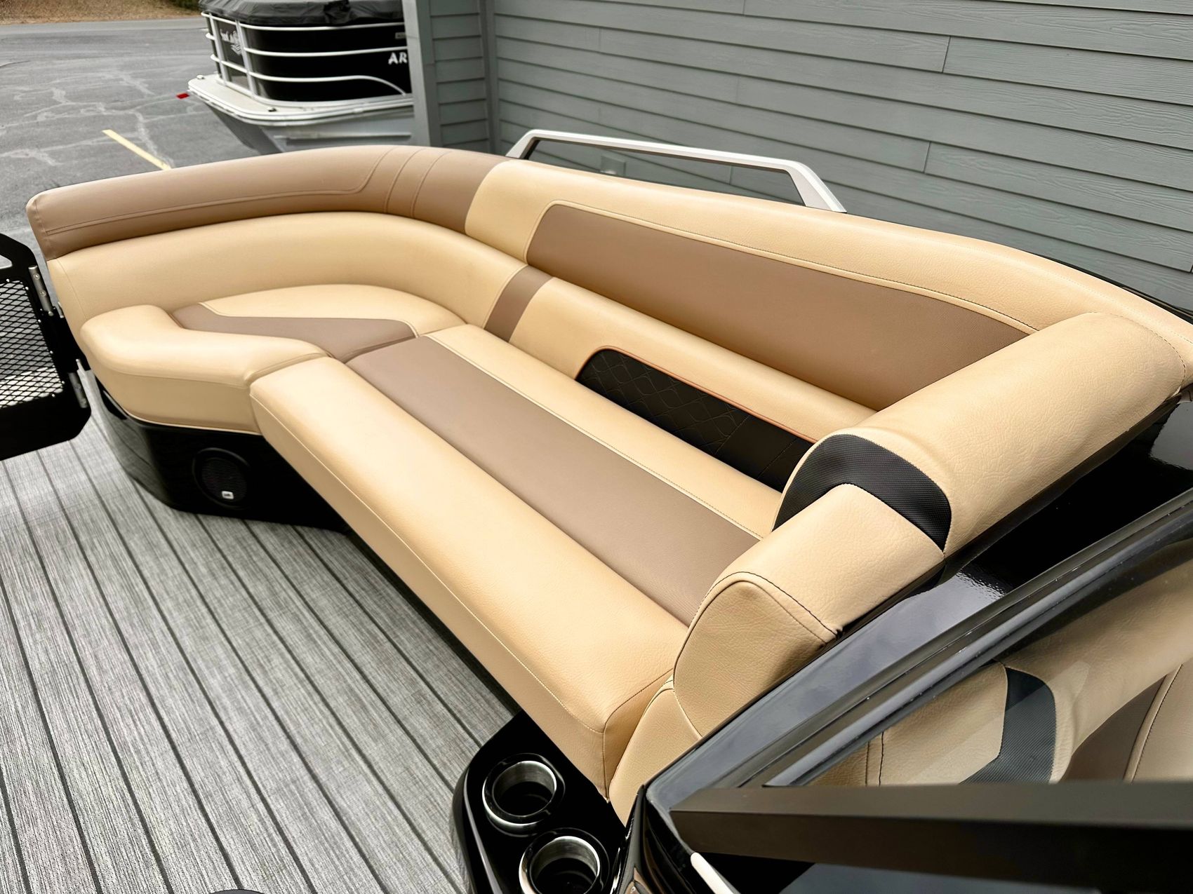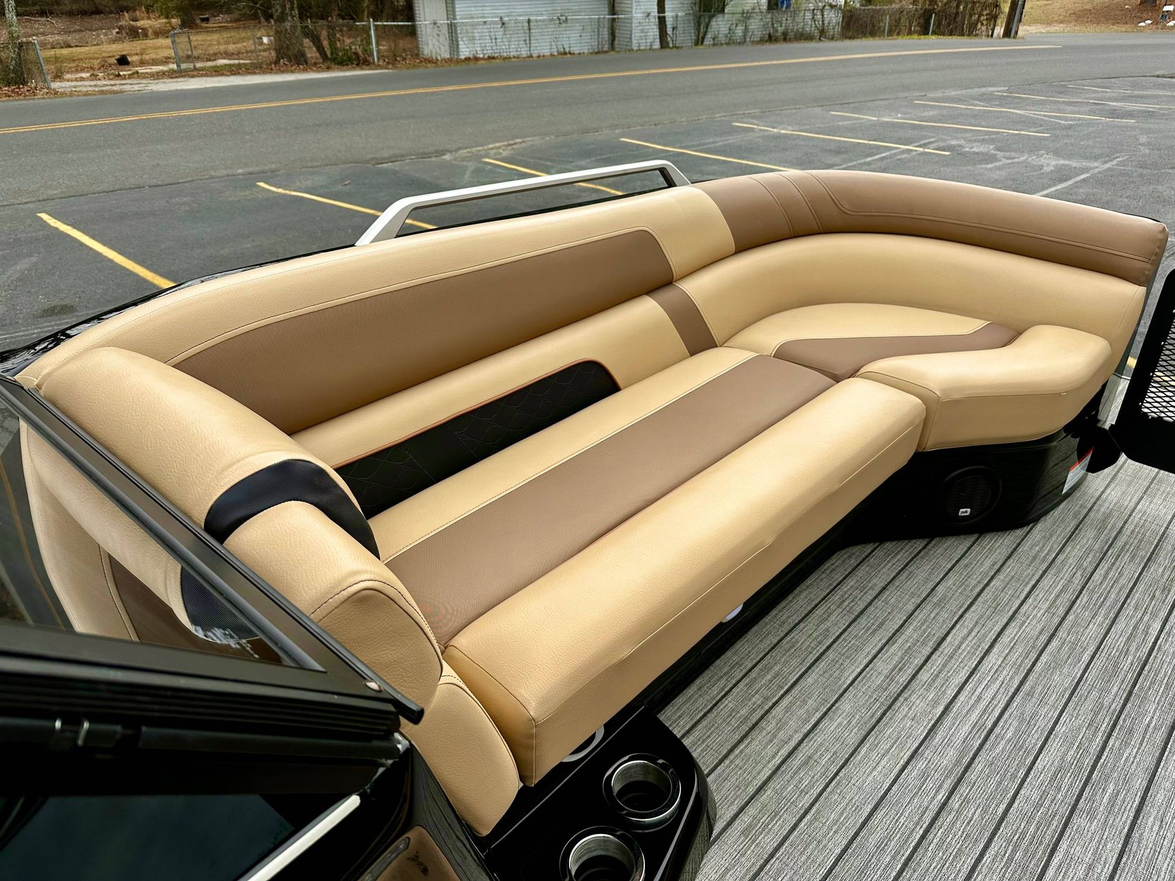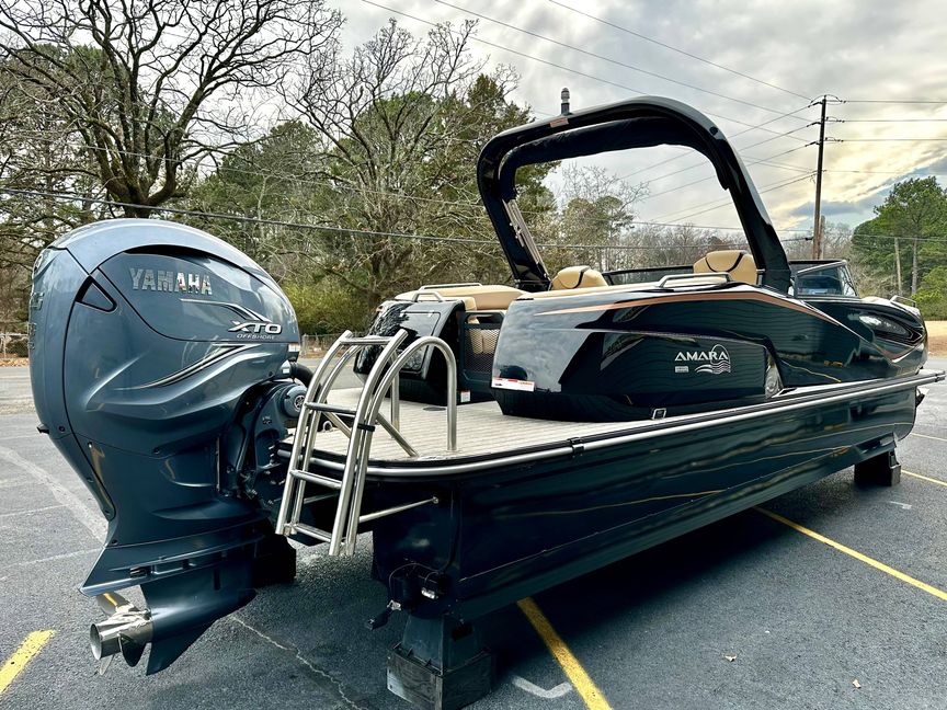 Whether it's for an adventurous outing, a casual cruise, or a fun-filled fishing trip, our black fiberglass triple pontoon can handle all types of water conditions with ease. Known for its durability and resistance to wear, it presents an outstanding lifestyle choice for avid boaters. Step aboard and start creating unforgettable memories today!