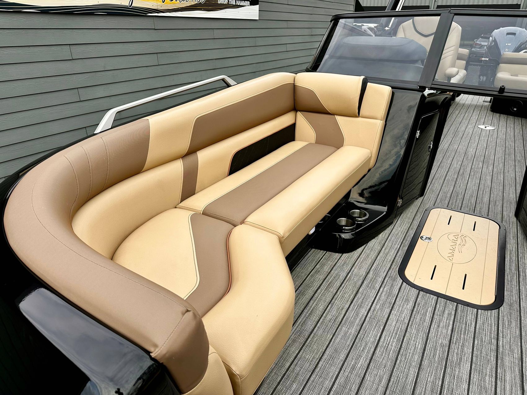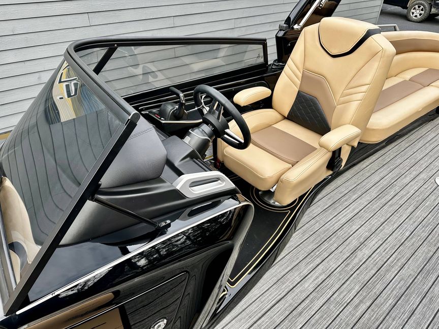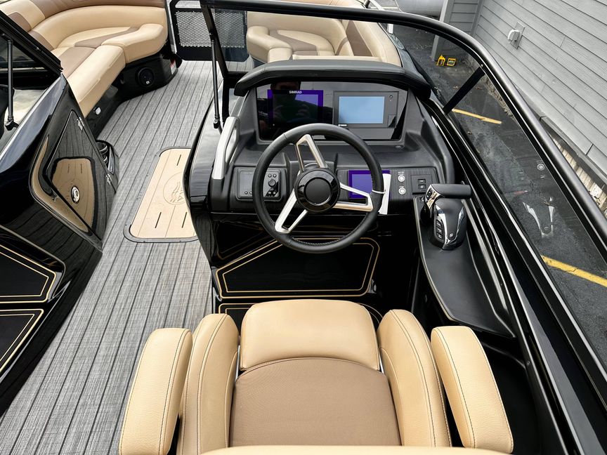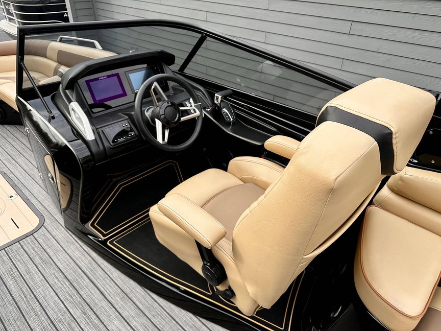 This is a premium offering in our lineup, a show-stopping masterpiece that effortlessly combines style, power, and performance in one sleek package. Crafted to perfection, our sexy black fiberglass triple pontoon is a head-turner on any water surface. It encapsulates an unapologetic bold personality that is sure to command attention from every direction.