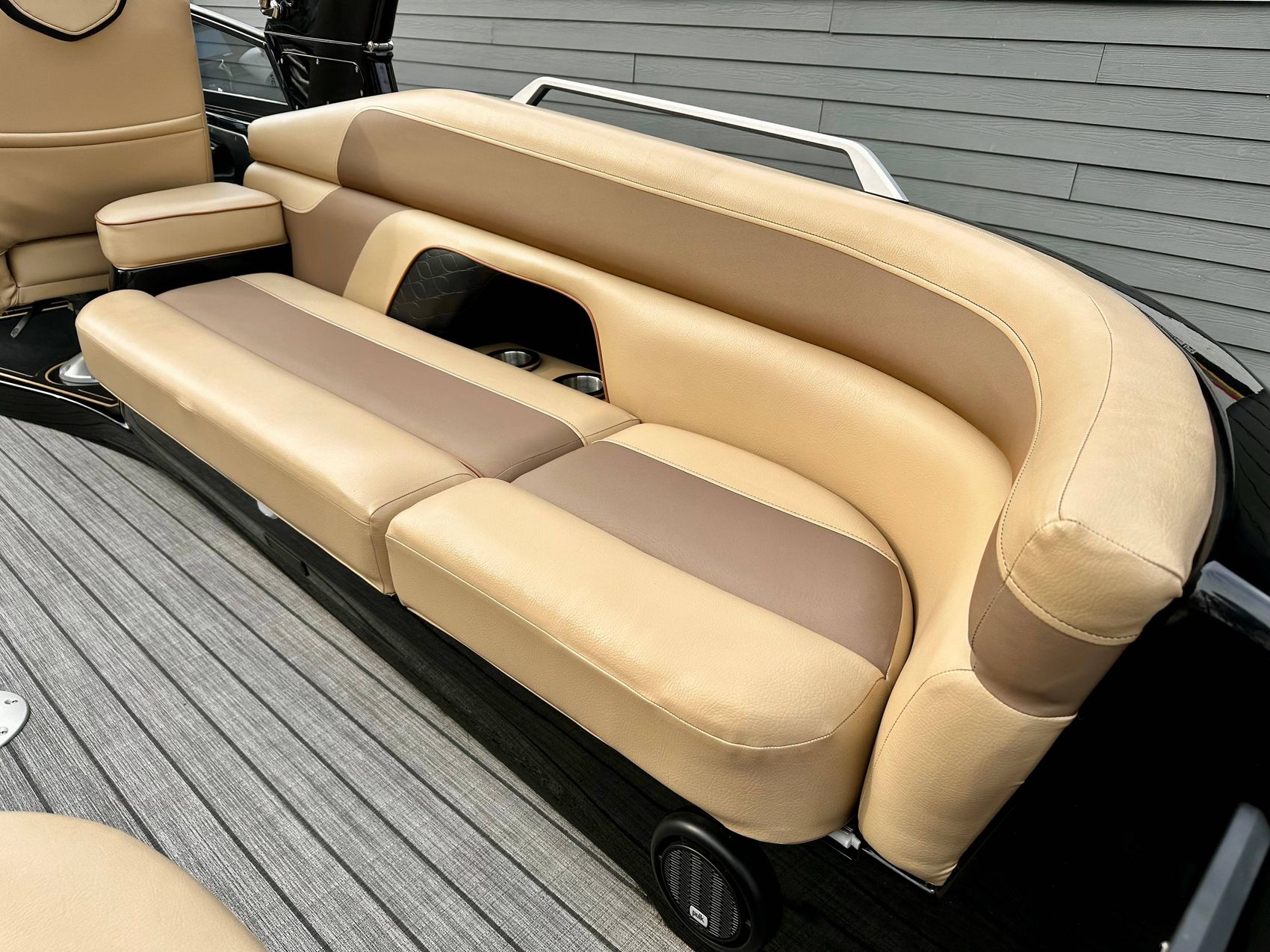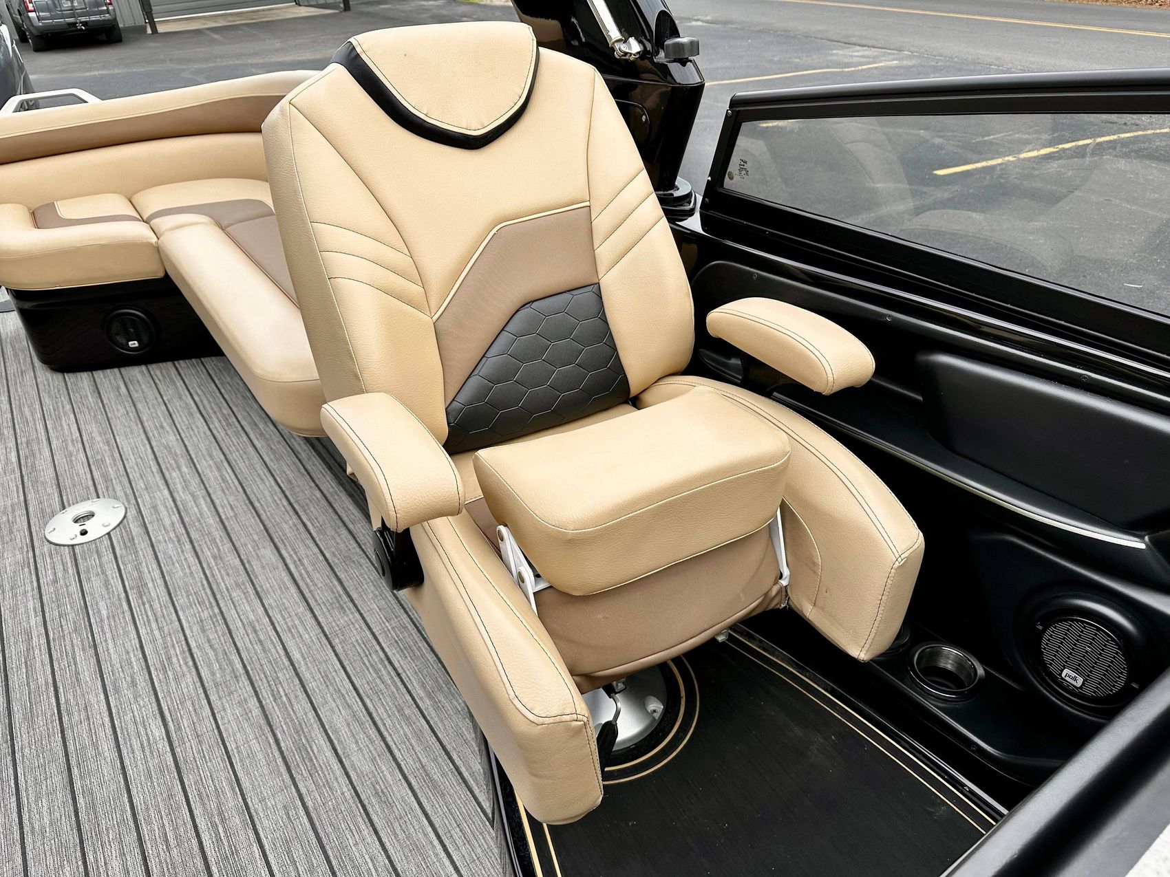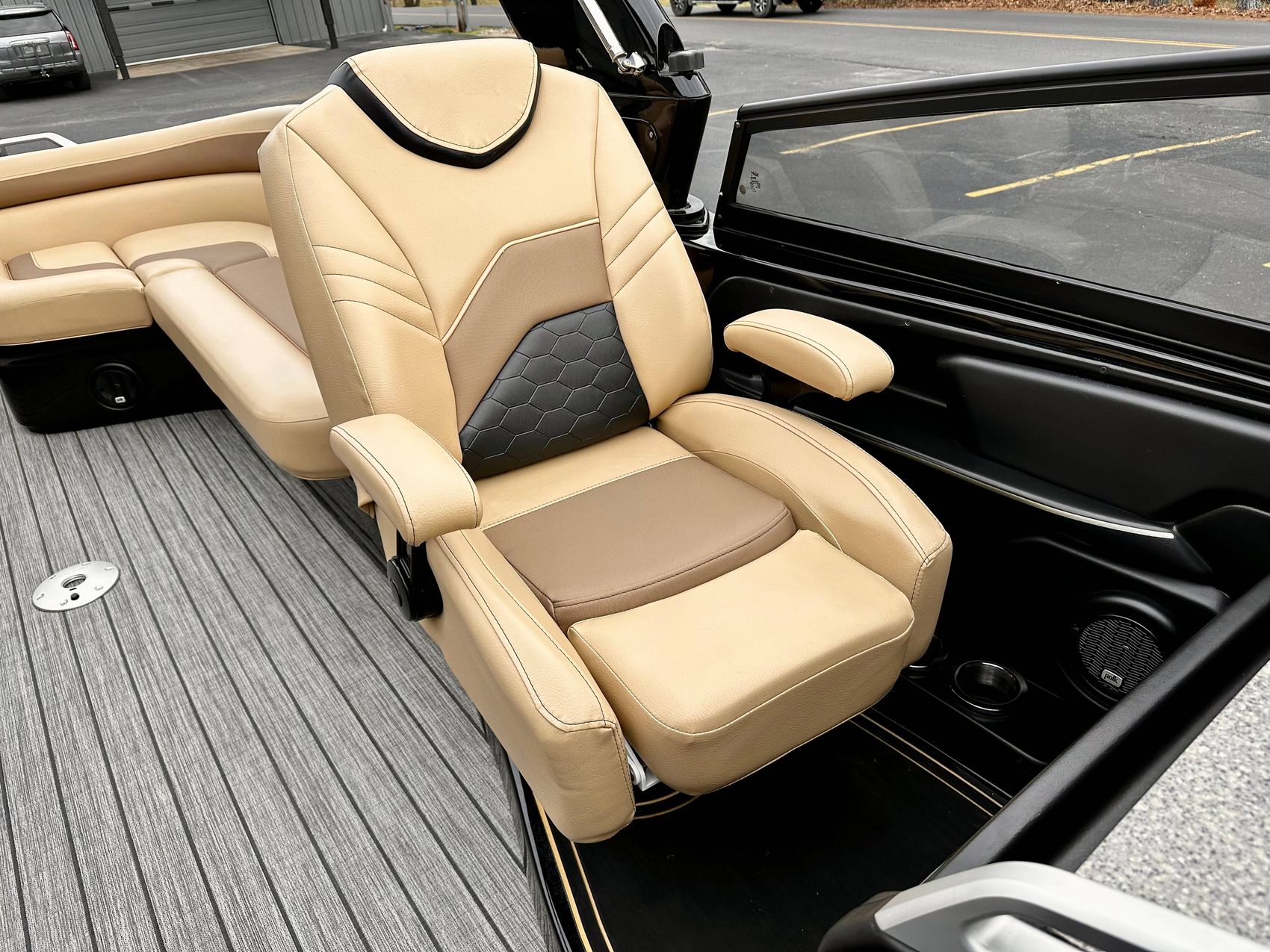 This is a premium offering in our lineup, a show-stopping masterpiece that effortlessly combines style, power, and performance in one sleek package. Crafted to perfection, our sexy black fiberglass triple pontoon is a head-turner on any water surface. It encapsulates an unapologetic bold personality that is sure to command attention from every direction.